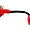 This 12″ dogbone style cord adapts 30 amp power for use with 15 amp RV, and has a finger grip male end for ease of use. Heavy duty cable, designed for outdoor use.